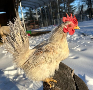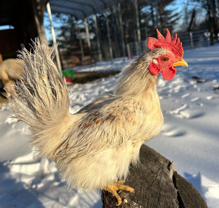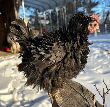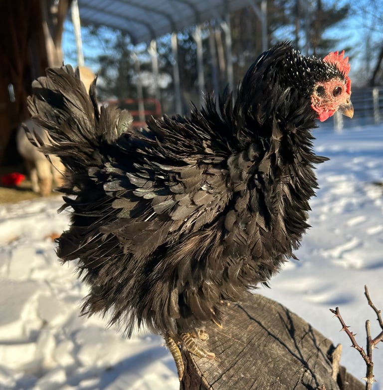 Inky is our youngest breeder, and he isn’t quite done growing yet. Although his flock mates have figured out how to be roosters, Inky still has a couple months of growing to do. He also has silkied feathers. He is actually a white chicken with a few brown feathers on his wings and black peppering his tail. The camera made his feathers look less white than they are.
