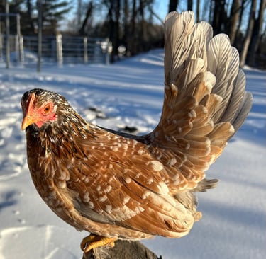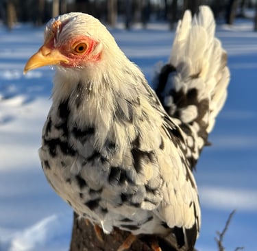 Broccoli is a very sweet hen. She’s curious and is one of the first to try new things. She also likes to be snuggled. Her feathers are really cool. Many of her feathers are tipped in white, so she looks like somebody spattered her with white paint.