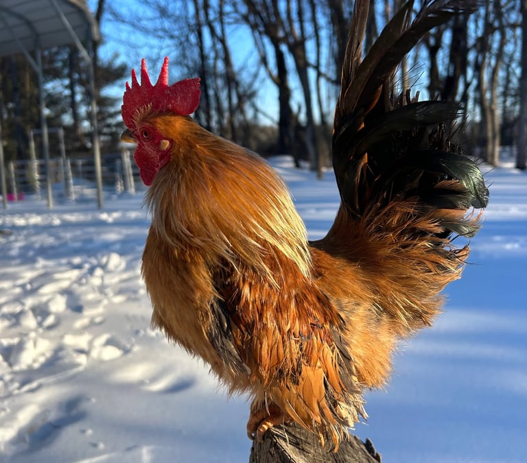 This is Timmy. For scale, Timmy is about 2/3 Twix’s size. Also, he IS the boss. Timmy has silkied feathers. Although you can’t see from the photo, his black tail feathers have a lovely green shimmer to them when the light hits right.