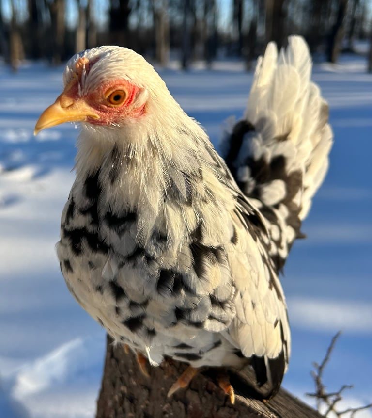 This is Chippy. She’s one of our youngest hens in the breeding flock. She is hatch mates with Inky. She’s also not fully mature—probably another month or two to full adulthood. Once again, the lighting wasn’t ideal. Her feathers are actually a stark black and white pattern.
